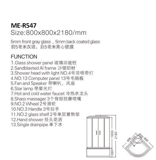 Base de douche | 1.Shower head Lumière 2.Star 3.Fan 4.Speaker Panneau de contrôle 5.Touchscreen 6. Dents blanches 7.faucet Étagère 8.Galss 9. Douche de douche 10. Système de vapeur 11.Foot massager 12.Body massager 13.Digital TV 14.Radio 15.LED light 16. Saisir 17.Un oreiller Autres..... |